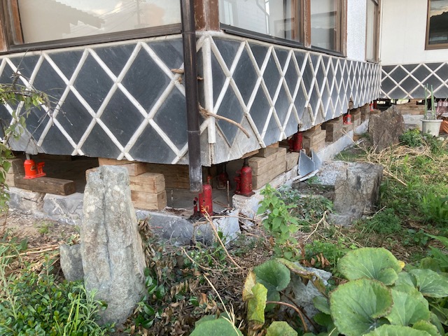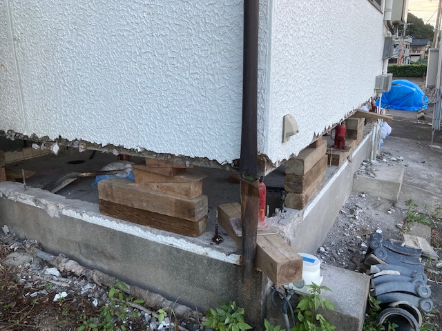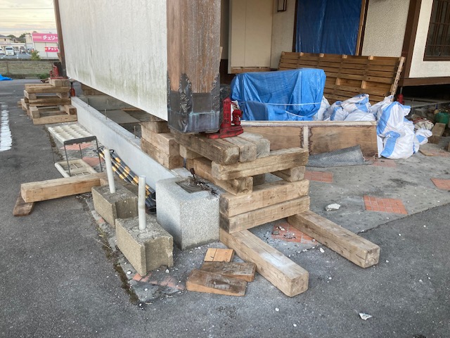 ジャッキで上げたところに角材を入れて支え、角材の上に縮めたジャッキを据え直し、またジャッキを上げて、、、を繰り返していきます。