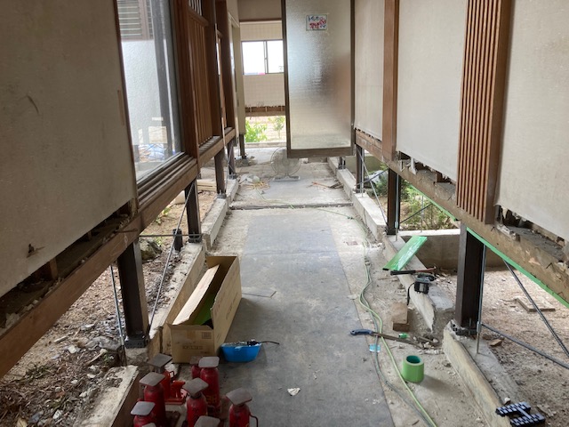 土台周りの作業のために、外部なまこ壁部分の撤去、外装板の撤去、内部腰板の撤去なども行いました。